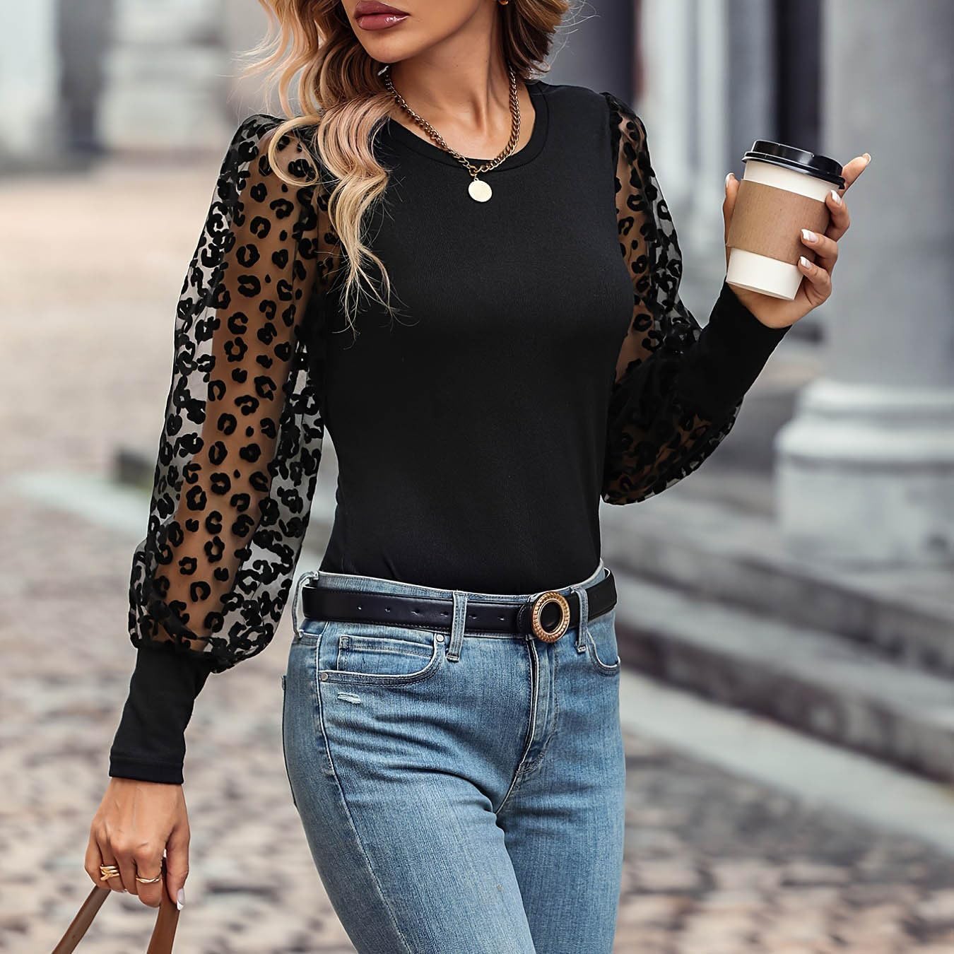 Waverly | Black Blouse With Leopard Lace Sleeves